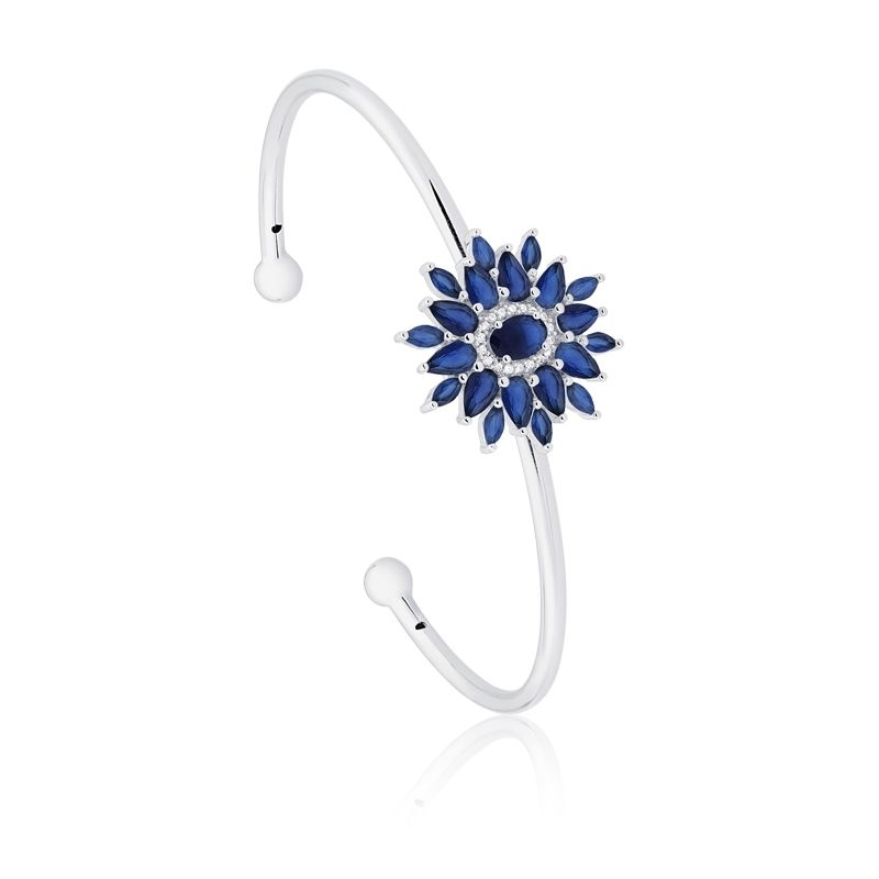 BRACELETE DE PRATA COM RÓDIO FLOR AZUL SAFIRA E ZIRCÔNIAS