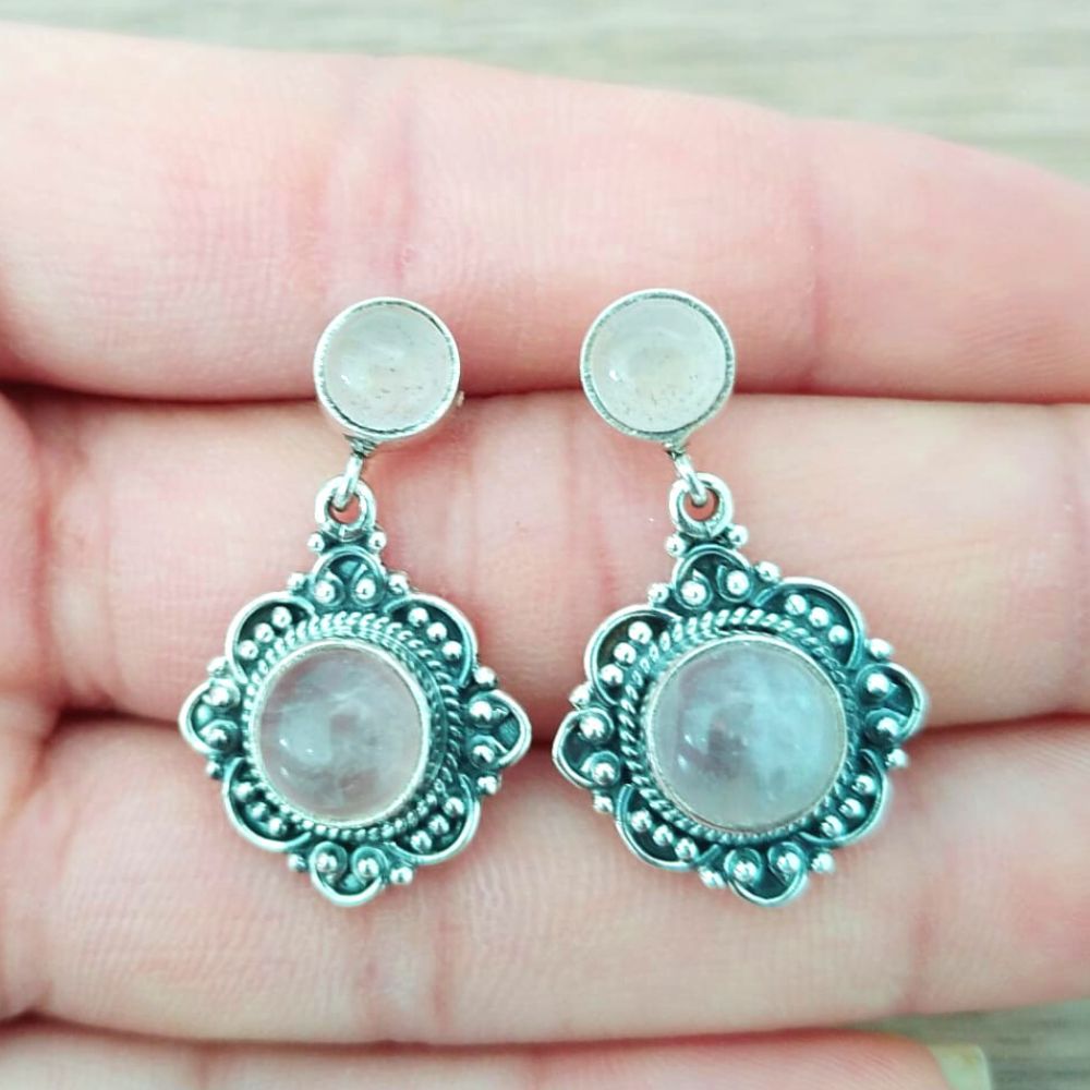 BRINCO DE PRATA GOTA TRABALHADO QUARTZO ROSA