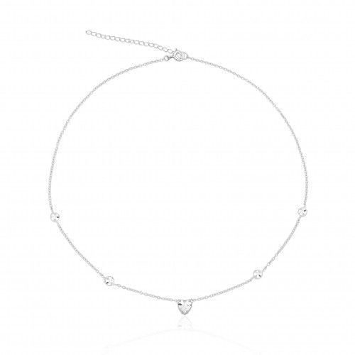 COLAR DE PRATA CHOKER GALERIA CORAÇÃO 6X6MM E REDONDO 4MM (4) ZIRCÔNIA BRANCA