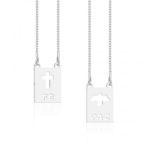 COLAR DE PRATA ESCAPULÁRIO LASER RETANGULAR CRUZ FÉ E PAZ VAZADO