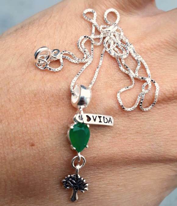 MIX DE PINGENTES COM PEDRA DE ZIRCÔNIA VERDE ESMERALDA EM FORMA DE GOTA, PLAQUINHA VIDA E ÁRVORE DA VIDA EM PRATA ENVELHECIDA.