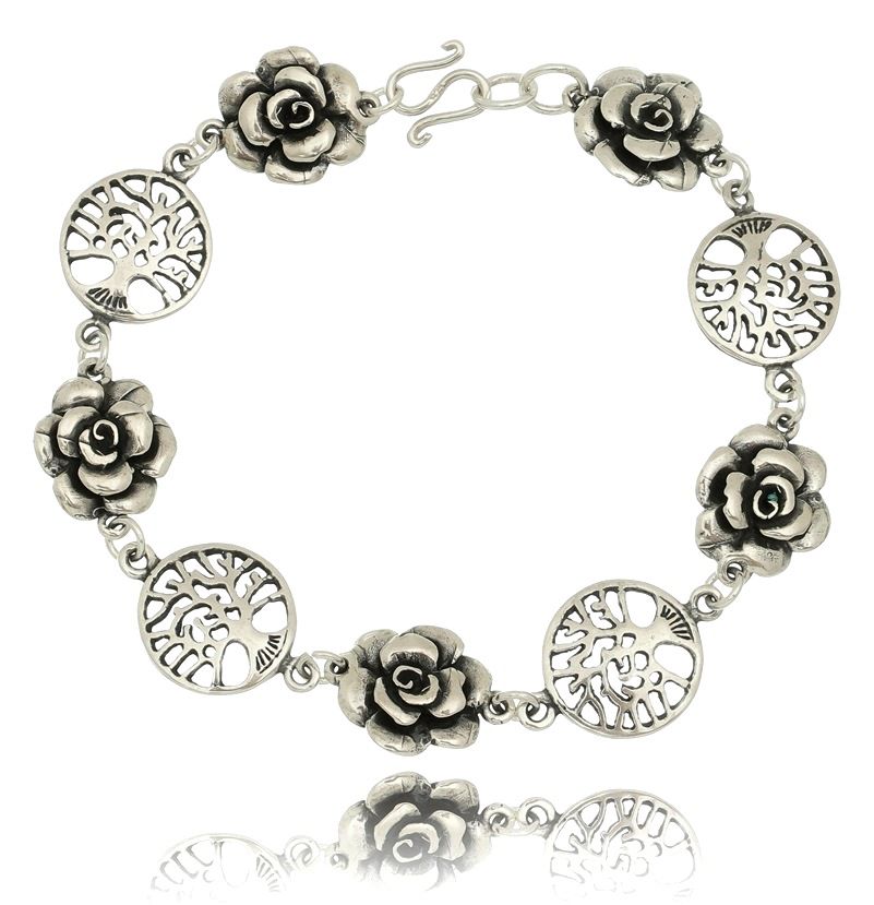 PULSEIRA DE PRATA DE BALI FLORES E ÁRVORES DA VIDA