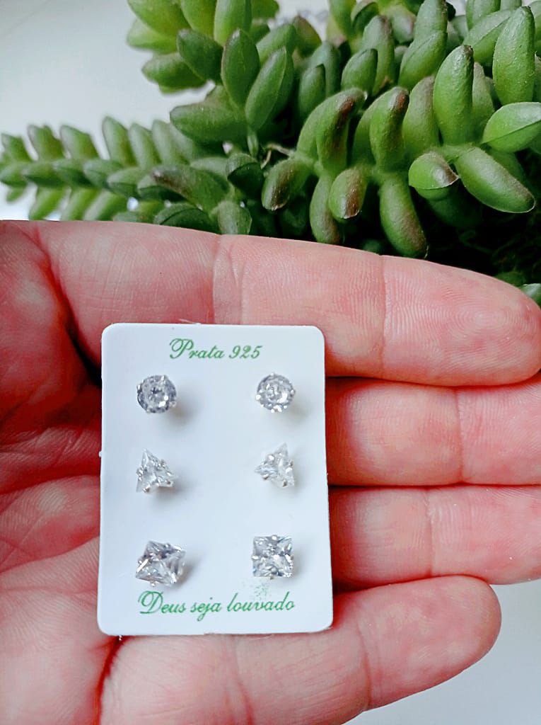 TRIO DE BRINCOS DE PRATA GEOMÉTRICOS ZIRCÔNIA