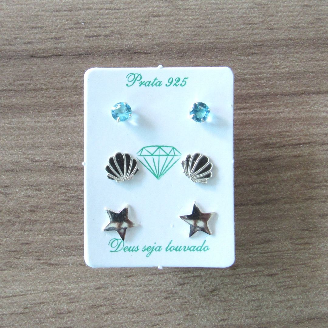 TRIO DE BRINCO DE PRATA PONTO DE LUZ AZUL, CONCHA E ESTRELA